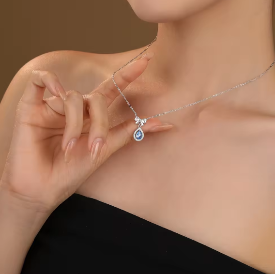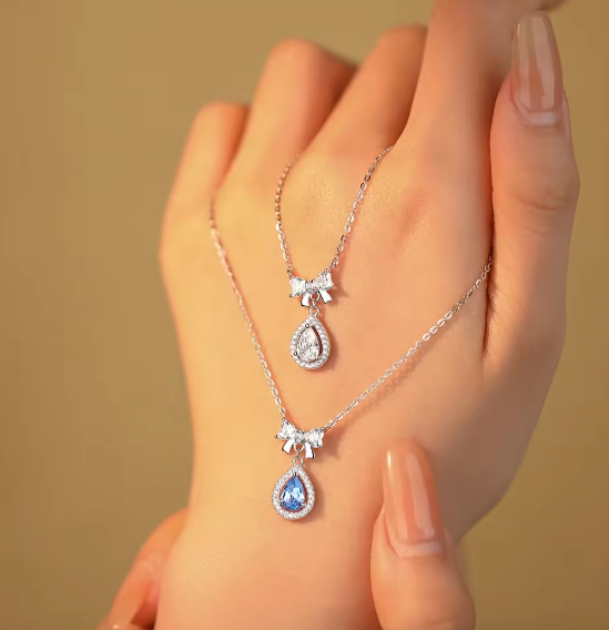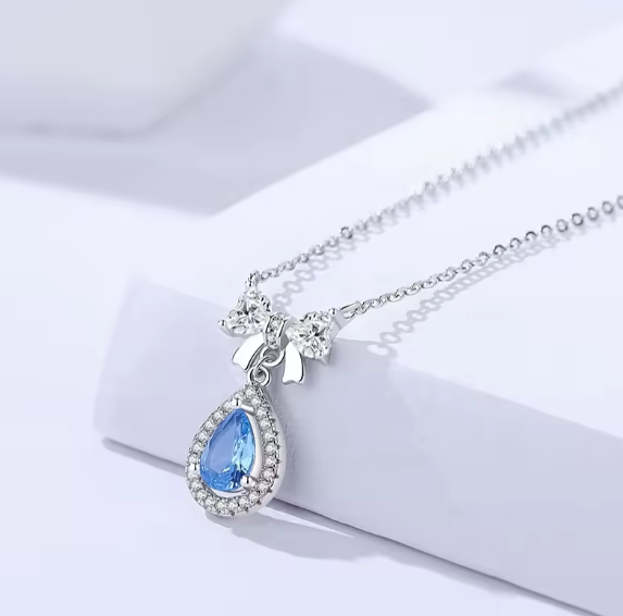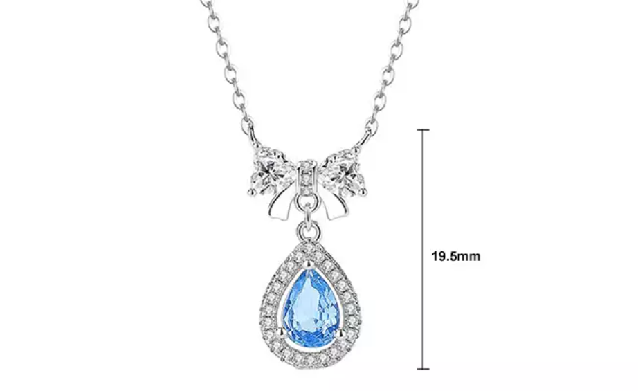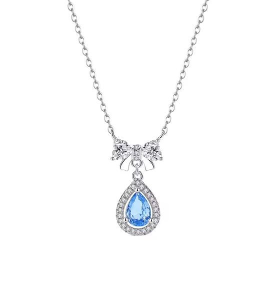 Acest colier elegant din Argint 925 cu piatră albastră de zirconiu, placat cu rodiu, prezintă un detaliu delicat de fundă pe lanț, adăugând o notă de farmec oricărei ținute. Confectionata manual cu atentie la detalii si un design delicat, aceasta piesa este perfecta atat pentru ocazii casual, cat si pentru ocazii formale.